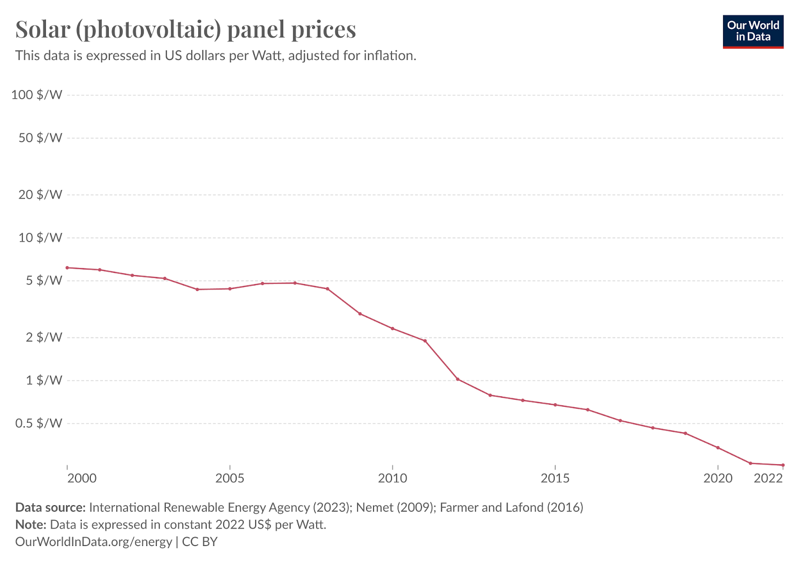 Data showing solar (photovoltaic) panel prices expressed in U.S. dollars per Watt. Source: Our World in Data