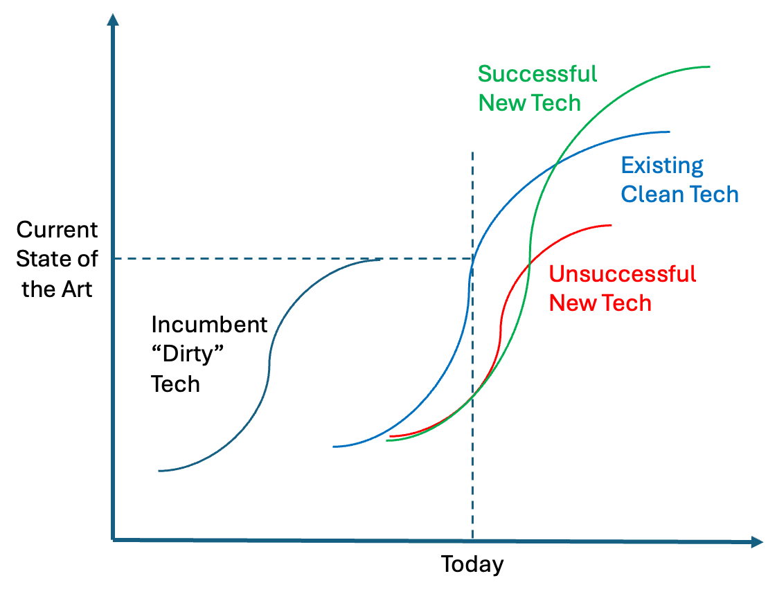 When developing new climate technologies and products, it’s common to use the incumbent “dirty” technology as a point of comparison. These incumbents have generally been around for a while and reached the flat portion of their s-curve, leaving them open to new technology overtaking them. However, in the current environment with many competitors developing new climate technologies, your fiercest competition may likely be another new technology that happens to be on the steep portion of the s-curve with a head start on you. The difference between success and failure is likely how your technology compares to a future start of the existing clean technology, not how you compare today.