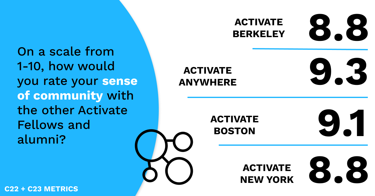 One of the most remarkable aspects of Activate Anywhere is the strength of the community we’ve built. We all wondered initially: “Can a virtual community really foster the same sense of connection as an in-person one?” The answer, as our data shows, is a resounding yes. In fact, on a scale of 1-10, fellows in the Activate Anywhere Community have consistently rated their sense of community even higher than those in traditional in-residence locations (Table 1). This outcome speaks to the power of shared purpose and the bonds that form when people come together to solve big problems, even when they’re not in the same room. Because these fellows don’t have as many entrepreneurial outlets in their existing ecosystems, the virtual community can sometimes be their only community.